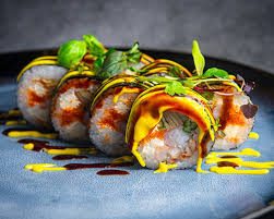 Уютная атмосфера зала Mys Resto, бокал сливового вина с тонким вкусом, закуски к вину и все ингредиенты для приготовления 2-х ролов: обычного и запеченного.